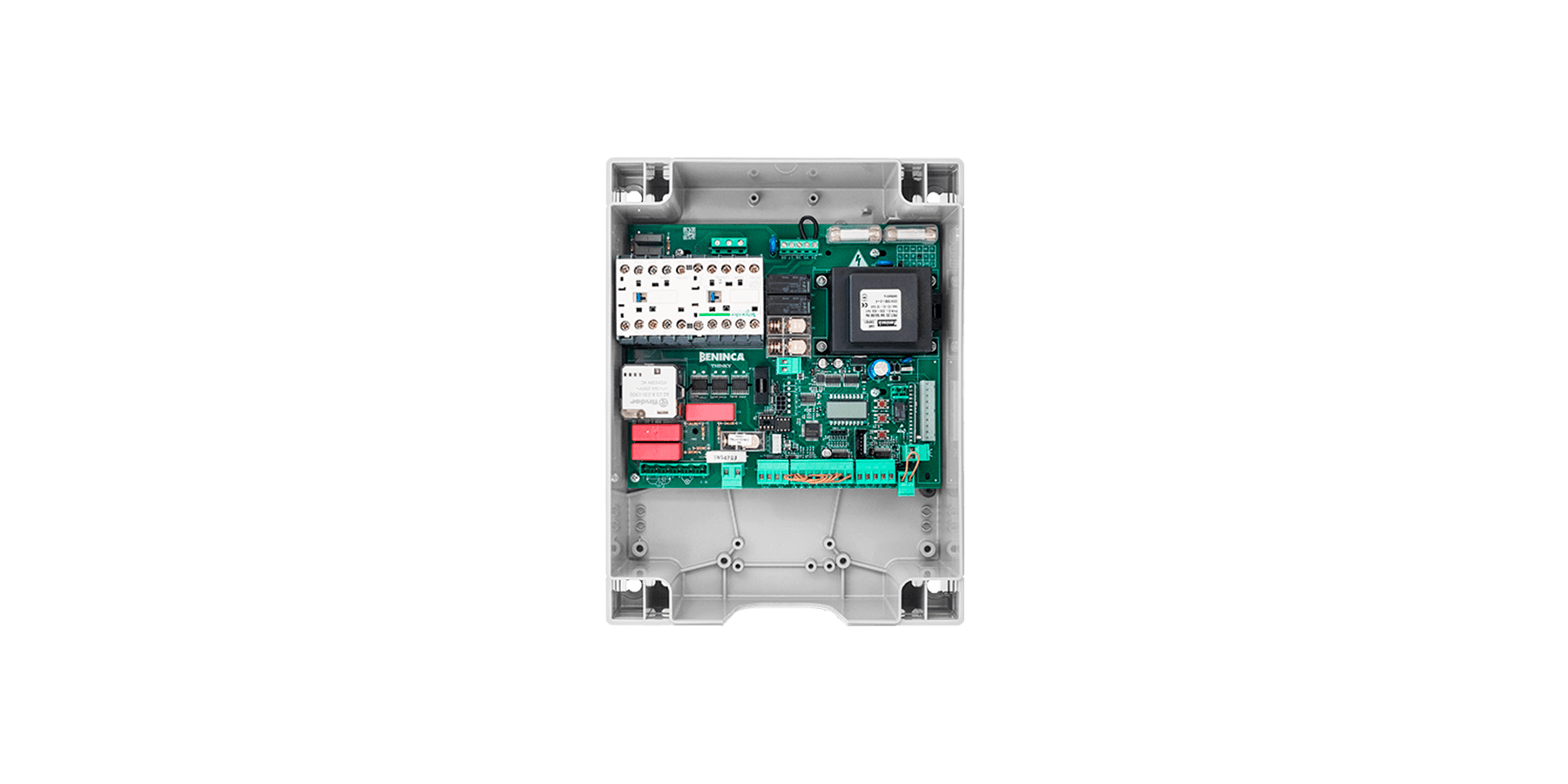 Integriertes LCD-Display | Integrierter Funkempfänger 433,92 MHz mit 64 Codes und ARC-Funkcodierung sowie Vorbereitung für Funkempfängeranschluss über Steckverbinder | Vorbereitung für Anschluss eines Absolutencoders und Schnellverkabelung (Motoren VN “ESW”) | Autoset Funktionsparameter bei Motoren mit Absolutencoder (VN “ESW”) | Herausnehmbare Klemmleisten | Funktionslogik automatisch, halbautomatisch und mit Totmann-Funktion | Eingänge für Motor Endschalter | Eingänge für Öffnen, Schließen, Schrittbetrieb, Gehtür und Stopp | Eingänge für 4 Lichtschrankenpaare (Aktivierung kann sowohl beim Öffnen als auch Schließen oder auch nur beim Schließen eingestellt werden) und PHOTO TEST-Logik | Eingang für N.C. oder 8K2 Sicherheits-Kontaktleiste | Eingang für Sicherheitssensor | Konfigurierbarer Ausgang für Kontrollleuchte „Tor offen“, zweiten Funkkanal, Hilfslicht und Bereichslicht | Konfigurierbarer Ausgang für Kontrollleuchte „Tor offen“ oder Lichtschrankentest | Ausgang für Blinkleuchtenanschluss | Phasenausfall- und Überstromschutz | Verwaltung der in der elektronischen Steuerung gespeicherten Parameter über Advantouch-System möglich | Anzahl der Bewegungen | Zugangspasswort für die Programmierung | Wartungsmeldung